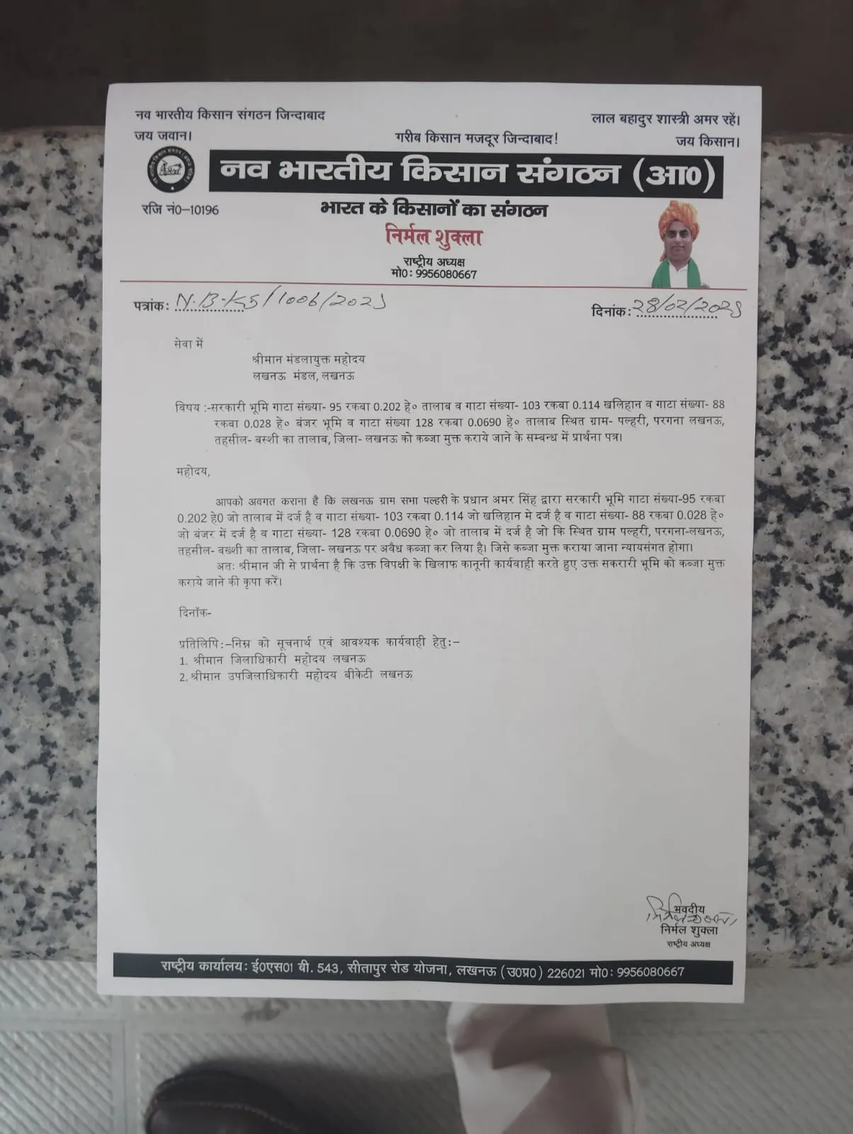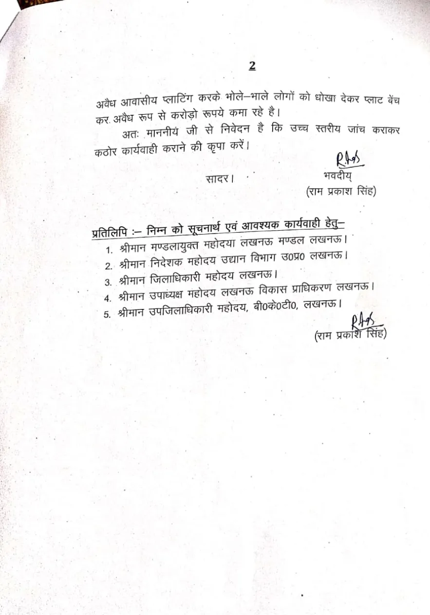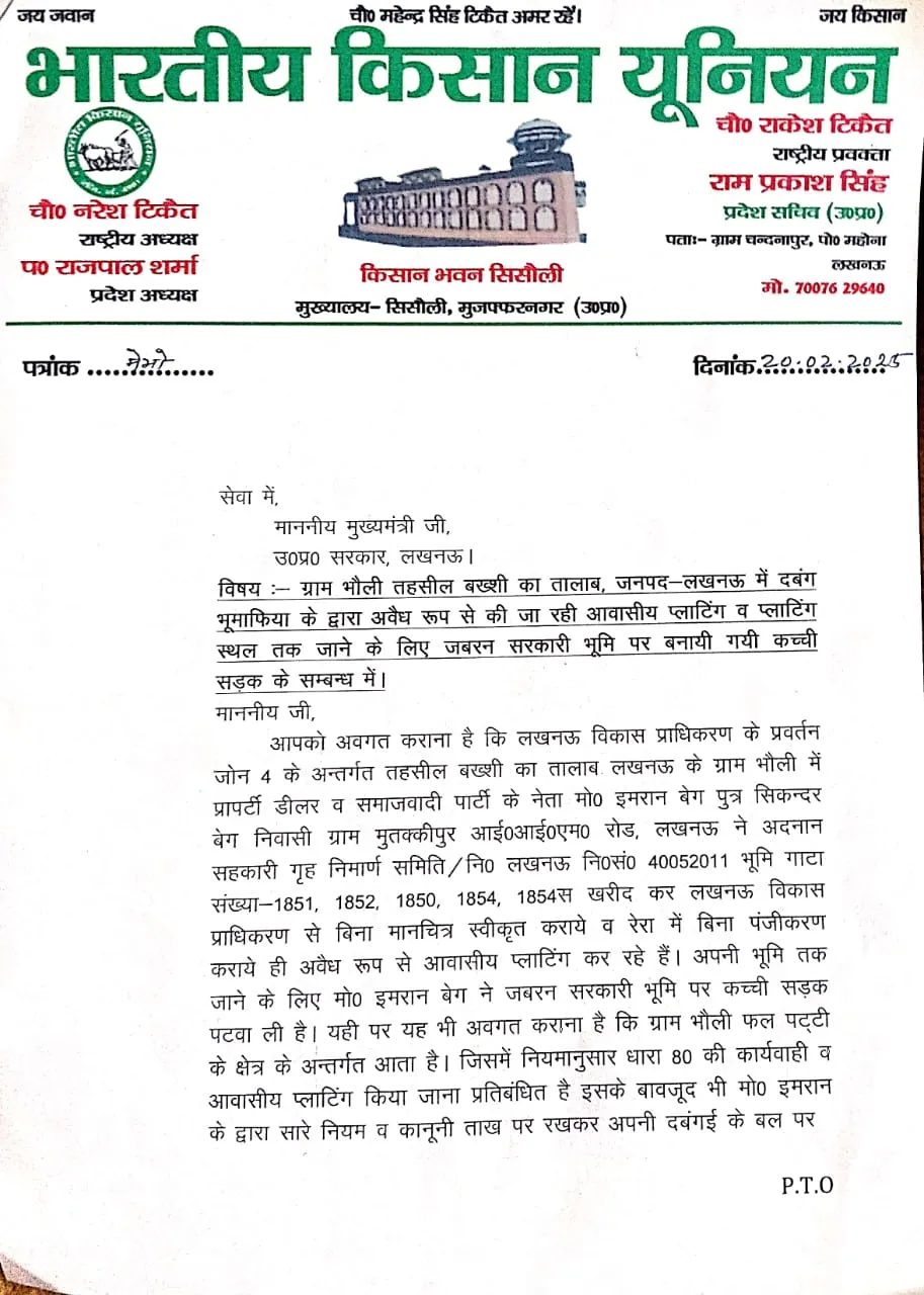 किसान नेता राम प्रकाश सिंह ने मंडलायुक्त,उद्यान विभाग निदेशक,जिलाधिकारी, विकास प्राधिकरण लखनऊ उपाध्यक्ष, उपजिलाधिकारी बीकेटी को शिकायती पत्र देकर आरोप लगाया है कि प्रवर्तन जोन चार के अंतर्गत बीकेटी तहसील के भौली गांव में प्रापर्टी डीलर व सपा नेता इमरान बेग निवासी मुतक्की ने भूमि गाटा संख्या 1851,1852,1850,1854, 1854स पर बिना एल डी ए से मानचित्र स्वीकृत कराए।