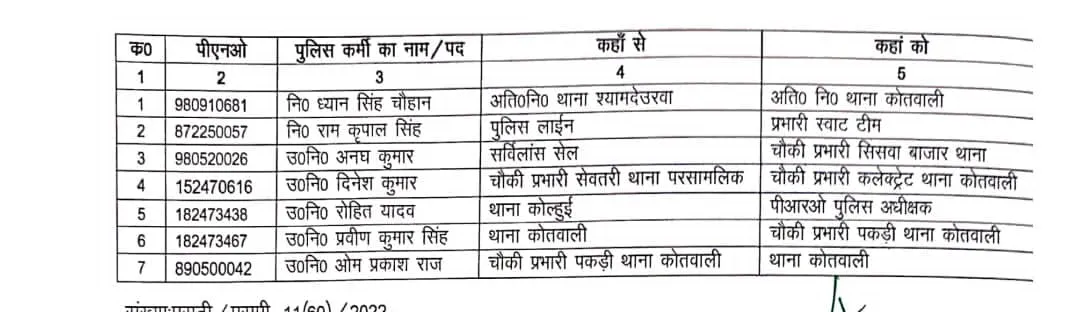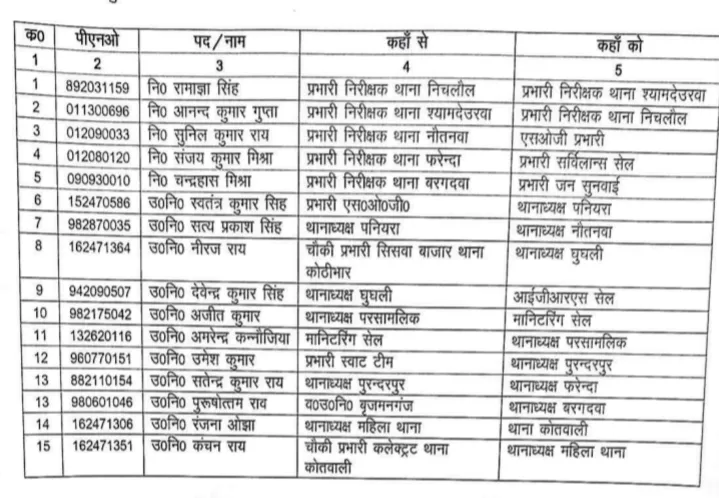 बरगदवां के थानाध्यक्ष चंद्रहास मिश्रा को प्रभारी जन सुनवाई बनाया गया है, तो वहीं परसामलिक के थानाध्यक्ष अजीत कुमार को मानीटरिंग सेल की जिम्मेदारी सौंपी गई है तथा नौतनवां थानाध्यक्ष को एसओजी प्रभारी के पद पर कार्यरत किया गया है। उप निरिक्षक बृजमनगंज पुरुषोत्तम राव को बरगदवां तथा मानीटरिंग सेल में तैनात रहे उप निरिक्षक अमरेंद्र कन्नौजिया को परसामलिक तथा थानाध्यक्ष पनियरा उपनिरीक्षक सत्य प्रकाश सिंह को नौतनवा व एसओजी प्रभारी स्वतंत्र कुमार सिंह को पनियरा थाने का नया थानाध्यक्ष बनाया गया है।