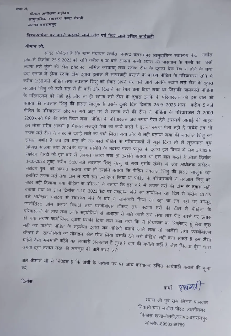 जिसमे उन्हेंअसप्ताल में भर्ती किया गया जंहा प्रसव नार्मल हुआ । जंहा स्टाप नर्स पर दवा इलाज न कर लापरवाही का आरोप पीड़ित ने लगाया है और जच्चा और बच्चा की हालत बिगड़ने पर मरीज को घर रात्रि 11,30 बजे घर ले आये