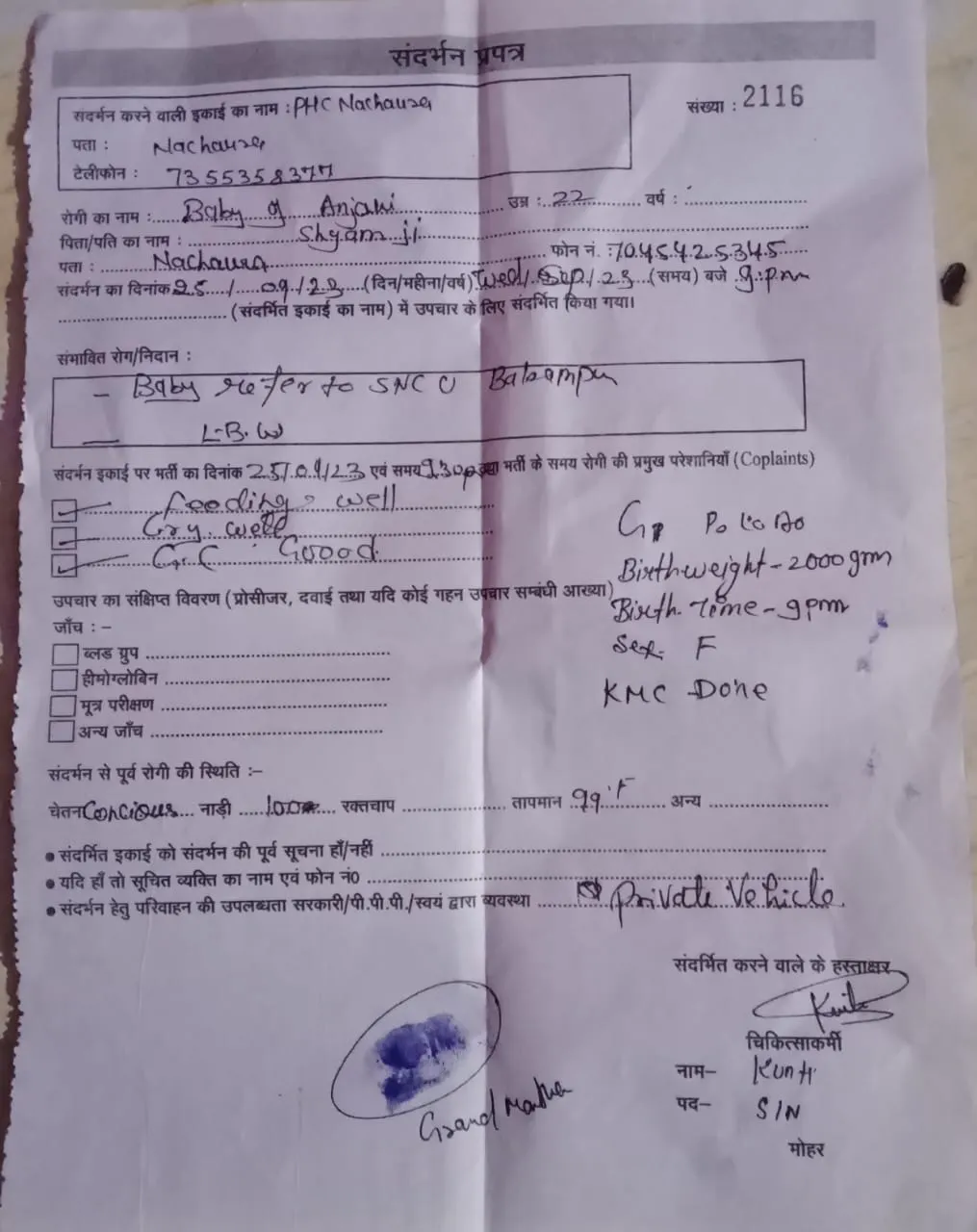 पूरा मामला नचौरा प्राथमिक स्वास्थ्य केंद्र का है जहां पर 25 तारीख को रात 9:00 बजे अंजनी पत्नी श्याम जी पासवान को लाया गया जिनका प्रसव के मामला था