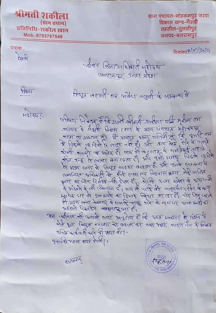 आप को बता दे की विद्युत उपकेंद्र तुलसीपुर के अंतर्गत जरवा कोइलाबास अंतरराष्ट्रीय सीमा क्षेत्र के गावो में पिछले 18 दिनों से विद्युत आपूर्ति न होने से स्थानीय लोगो मे आक्रोश देखने को मिल रहा है जिसके कारण से ग्राम प्रधान शकीला ने एक शिकायती प्रार्थना पत्र जिलाधिकारी बलरामपुर को भेजा है।