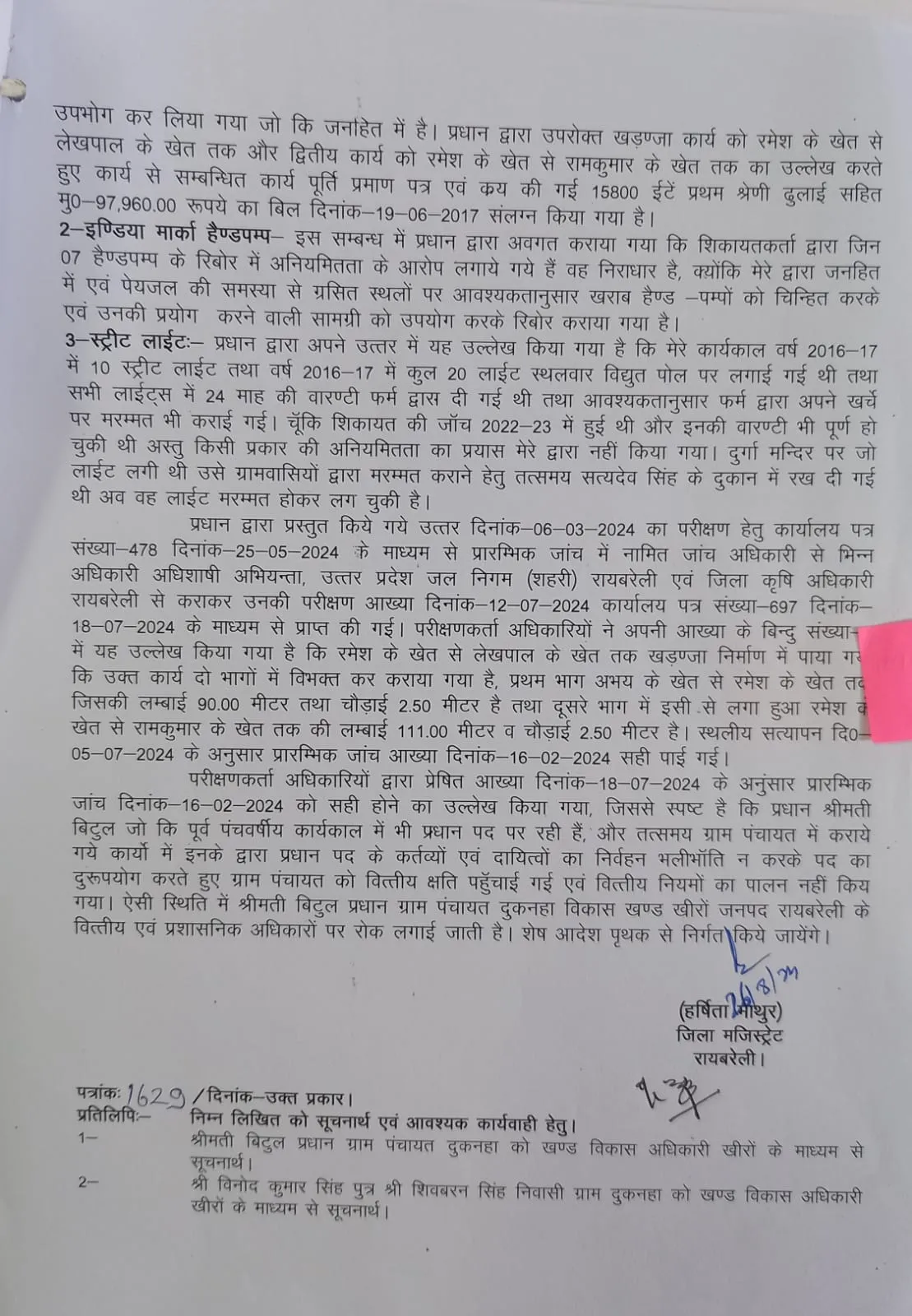 जांच रिपोर्ट का संज्ञान लेते हुए डीएम ने शुक्रवार को एक पत्र जारी करते हुए लिखा कि पूर्व पंचवर्षीय कार्यकाल में प्रधान रह चुकी व मौजूदा समय में दुकनहा गांव की प्रधान बिटुल साहू ने प्रधान पद के कर्तव्यों व दायित्वों का निर्वहन न करते हुए पद का दुरुपयोग किया। ग्राम पंचायत को वित्तीय क्षति पहुंचाई। वित्तीय नियमों का पालन नहीं किया गया है। लिहाजा डीएम ने दुकनहा गांव की मौजूदा प्रधान बिटुल साहू के वित्तीय व प्रशासनिक अधिकारों पर रोक लगा दी है।