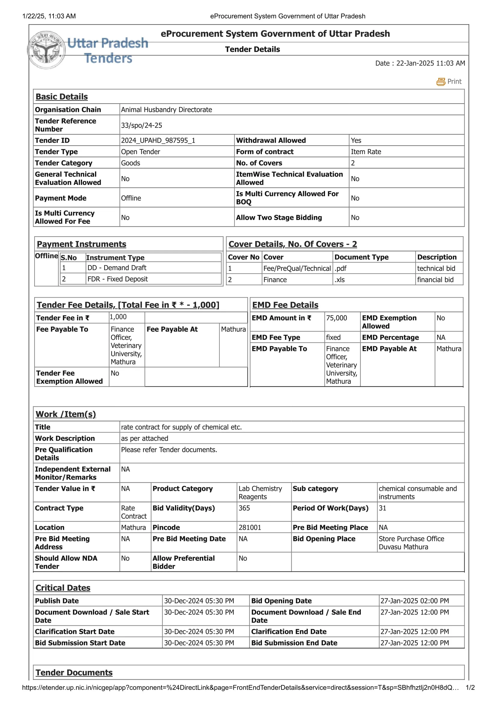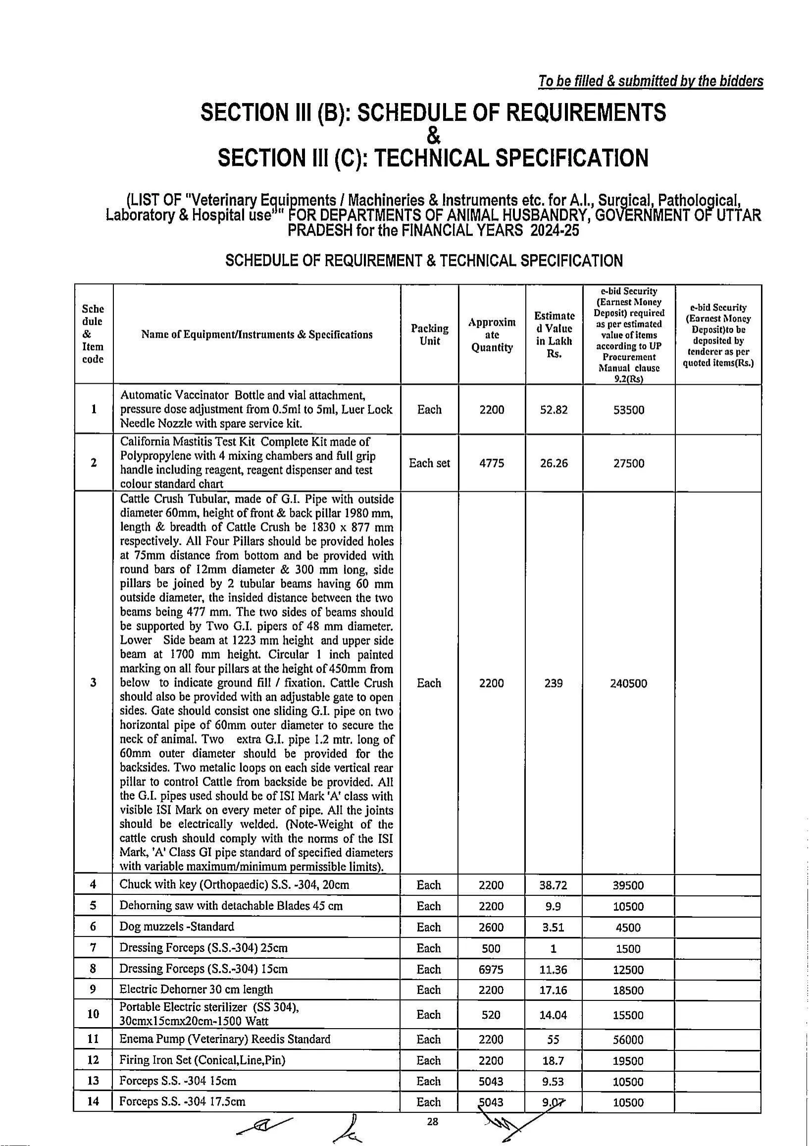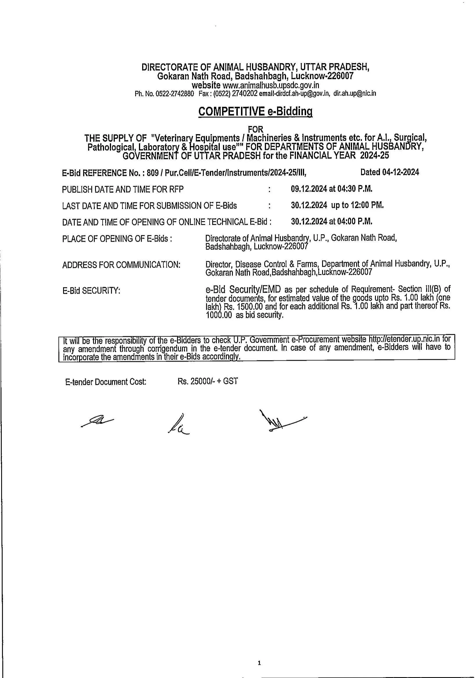 आमंत्रित की गयी थी, जिसकी की अंतिम तिथि 10 जनवरी 2024 थी, उक्त निविदा के द्वारा तमाम प्रकार के उपकरणों की खरीद की जानी है, इसलिए पशुपालन निदेशालय लखनऊ के स्तर पर ही कंपनियों से सांठ गाँठ करके निविदा प्रपत्र का मूल्य रूपये25000/- कर दिया गया और उसपर 18 प्रतिशत की दर से GST लगाकर कुल मूल्य 29500/- रूपये कर दिया गया,