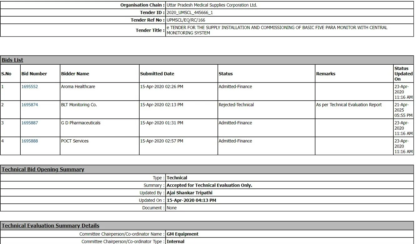 उत्तर प्रदेश मेडिकल कारपोरेशन द्वारा नवजात शिशुओं के लिए खरीदे गए जीवन रक्षक उपकरण पेशेंट मॉनिटर के टेंडर संख्या UPMSCL/EQ/RC/166 में कुल चार कंपनियों ने प्रतिभाग किया जिसमे से दो कम्पनिया POCT SERVICES, AROMA HEALTHCARE सौरभ गर्ग और अभय अग्रवाल की है, जिनको टेक्निकल और फाइनेंसियल बिड दोनों में पास किया गया, सबसे बड़ा सवाल यह है की एक ही व्यक्ति की दो कंपनियों को एक ही टेंडर में कैसे और क्यों प्रतिभाग करने दिया जा रहा है? यह तो नियम विरुद्ध है