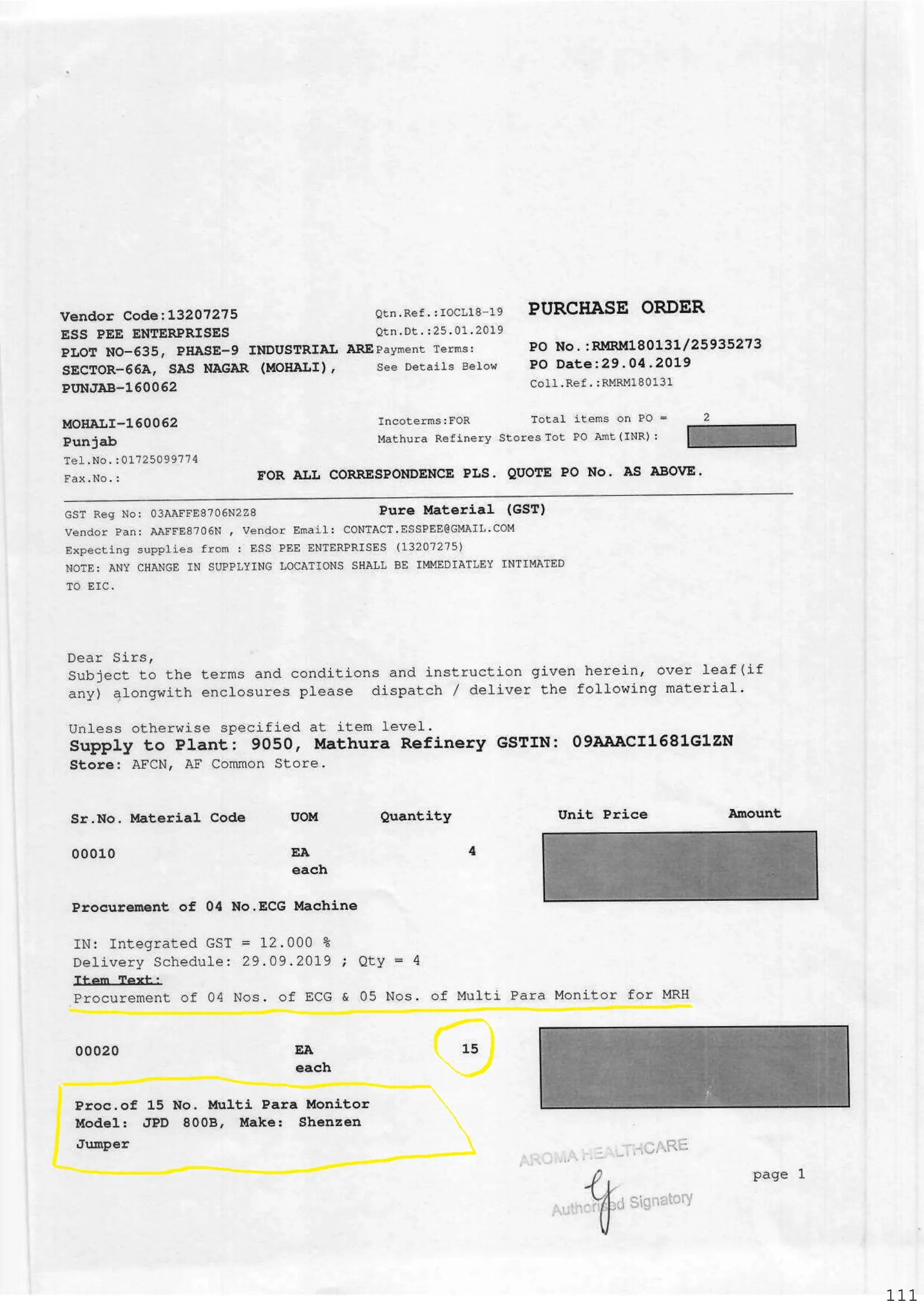 उत्तर प्रदेश मेडिकल कारपोरेशन द्वारा नवजात शिशुओं के लिए खरीदे गए जीवन रक्षक उपकरण पेशेंट मॉनिटर के टेंडर संख्या UPMSCL/EQ/RC/166 में AROMA HEALTHCARE द्वारा जो ESS PEE ENTERPRISES को मिला हुआ इंडियन आयल कारपोरेशन की मथुरा REFINARY से मिले मॉनिटर के आर्डर जो मात्र 05 मॉनिटर के लिए था उसको बदल कर 15 मॉनिटर कर दिया गया, इस तरीके से फर्जीवाड़ा करके टेंडर हथियाया गया है, यह एक संगीन प्रकरण है,