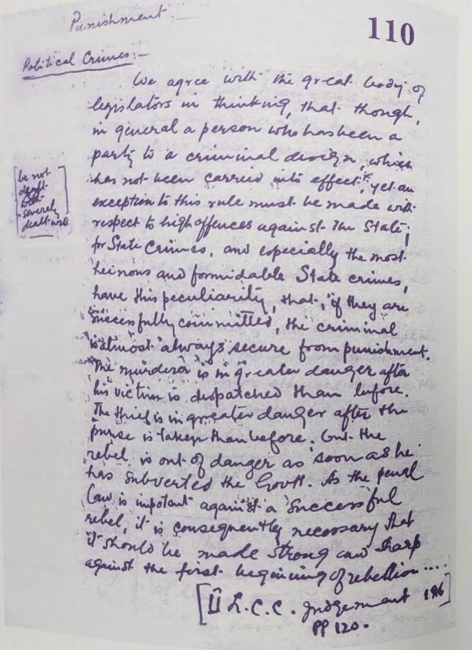 अपनी नोटबुक के पृष्ठ 21 पर, उन्होंने अमेरिकी समाजवादी यूजीन वी. डेब्स का उद्धरण लिखा: “जहाँ कहीं निचला वर्ग है, मैं वहाँ हूँ; जहाँ कहीं आपराधिक तत्व हैं, मैं वहाँ हूँ; अगर कोई कैद है, तो मैं स्वतंत्र नहीं हूँ।” उन्होंने रूसो, थॉमस जेफरसन और पैट्रिक हेनरी के स्वतंत्रता संघर्षों पर भी नोट्स बनाए, साथ ही मानव के अहस्तांतरणीय अधिकारों पर भी। इसके अतिरिक्त, उन्होंने लेखक मार्क ट्वेन का प्रसिद्ध उद्धरण दर्ज किया:“हमें सिखाया गया है कि लोगों का सिर काटना कितना भयानक है। लेकिन हमें यह नहीं सिखाया गया है कि सभी लोगों पर जीवनभर गरीबी और अत्याचार थोपने से होने वाली मृत्यु और भी अधिक भयानक है।”