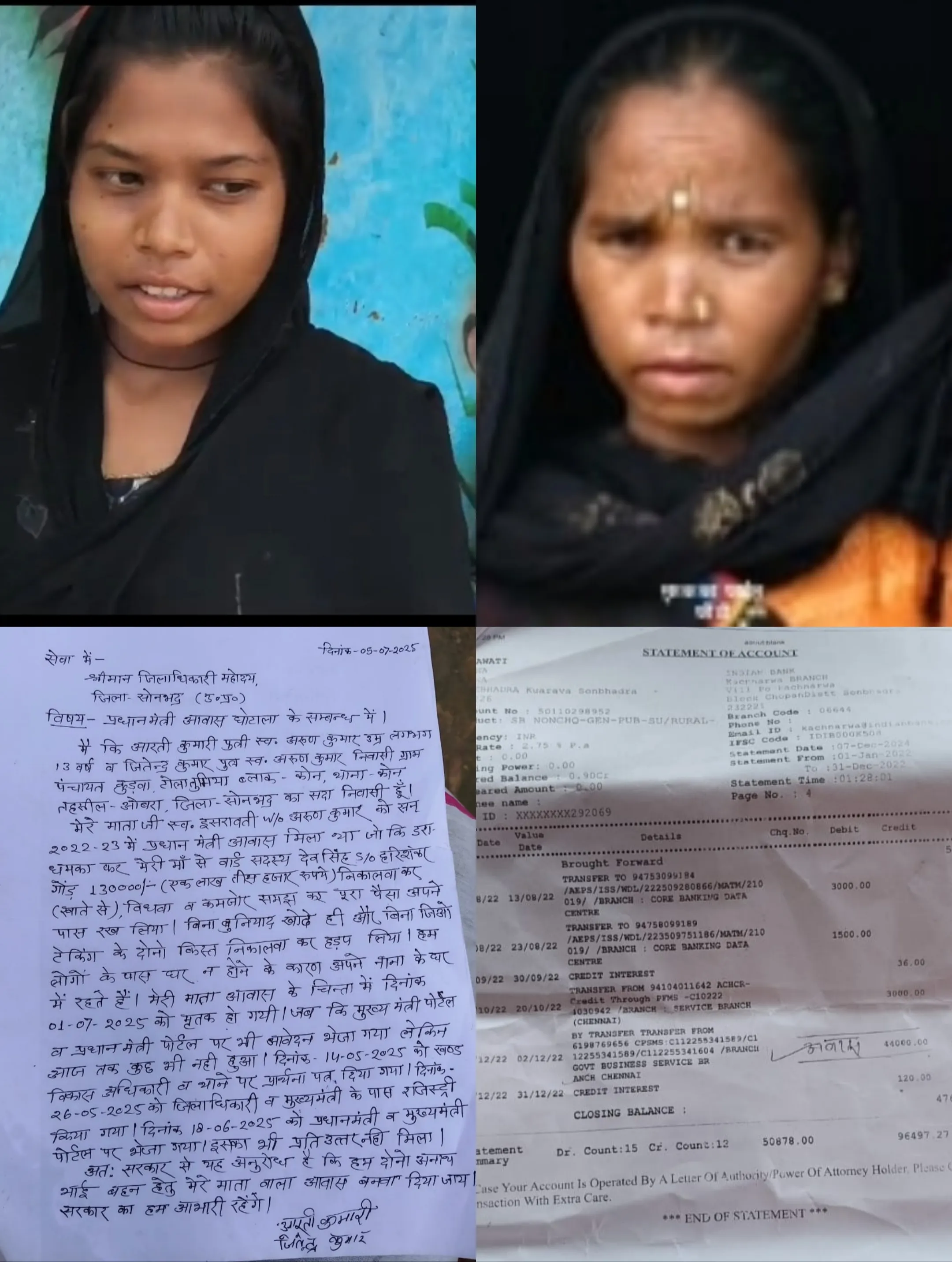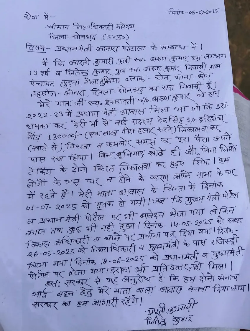 जिसके क्रम में मृतक की अनाथ बच्ची आरती गोंड. ने वार्ड सदस्य के ऊपर आरोप लगाते हुए कही कि मेरी माँ इशरावती देवी के नाम वर्ष 22-23 में प्रधानमंत्री आवास आया था जो अब नहीं रहीं। जिसे वार्ड सदस्य व अन्य लोगों की मिली भगत से अलग अलग बैंकों से धोखाधड़ी कर धन निकाल लिया गया । जिसके क्रम में मेरी माँ द्वारा प्रधानमंत्री, मुख्यमंत्री, जिलाधिकारी समेत कई अधिकारियों को पत्र भेजकर अवगत कराया किन्तु आज तक आवास का लाभ नहीं मिल सका और वहीं पुन: जिलाधिकारी को पत्र भेजकर कार्रवाई की मांग किया है।