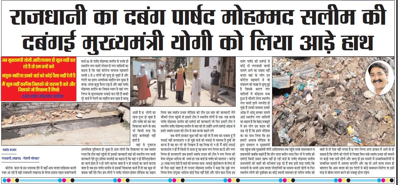 जब योगी सरकार कुछ नहीं कर रही तो मैं क्या कर सकता हूं मैं सफाई नहीं करवाऊंगा न ही मुझे वार्ड की सफाई से मतलब है तुम्हें जो करना है वह कर लो जो लिखना है वह लिख दो न ही मैं कोई सफाई करवाऊंगा न हीं मैं किसी से डरता हूं यह काम नगर निगम का है और नगर निगम ही करवाएगी जब हमारी स्वतंत्र प्रभात की टीम ने नगर निगम की मेयर संयुक्ता भाटिया जो स्वयं हर एक वार्ड के पार्षद को सालाना 1 करोड़ 25 लाख रुपए देती है वार्ड की मरम्मत साफ-सफाई सुंदरीकरण के लिए तो वो पैसा कहां जाता है तो परसद मोहम्मद सलीम ने कहा कि मुझे नगर निगम मेयर संयुक्ता भाटिया कोई पैसा नहीं देती और फोन काट दिया इस दबंग पार्षद की दबंगई से कोई भी नगरवासी जल्दी सामने आने का साहस नहीं करता