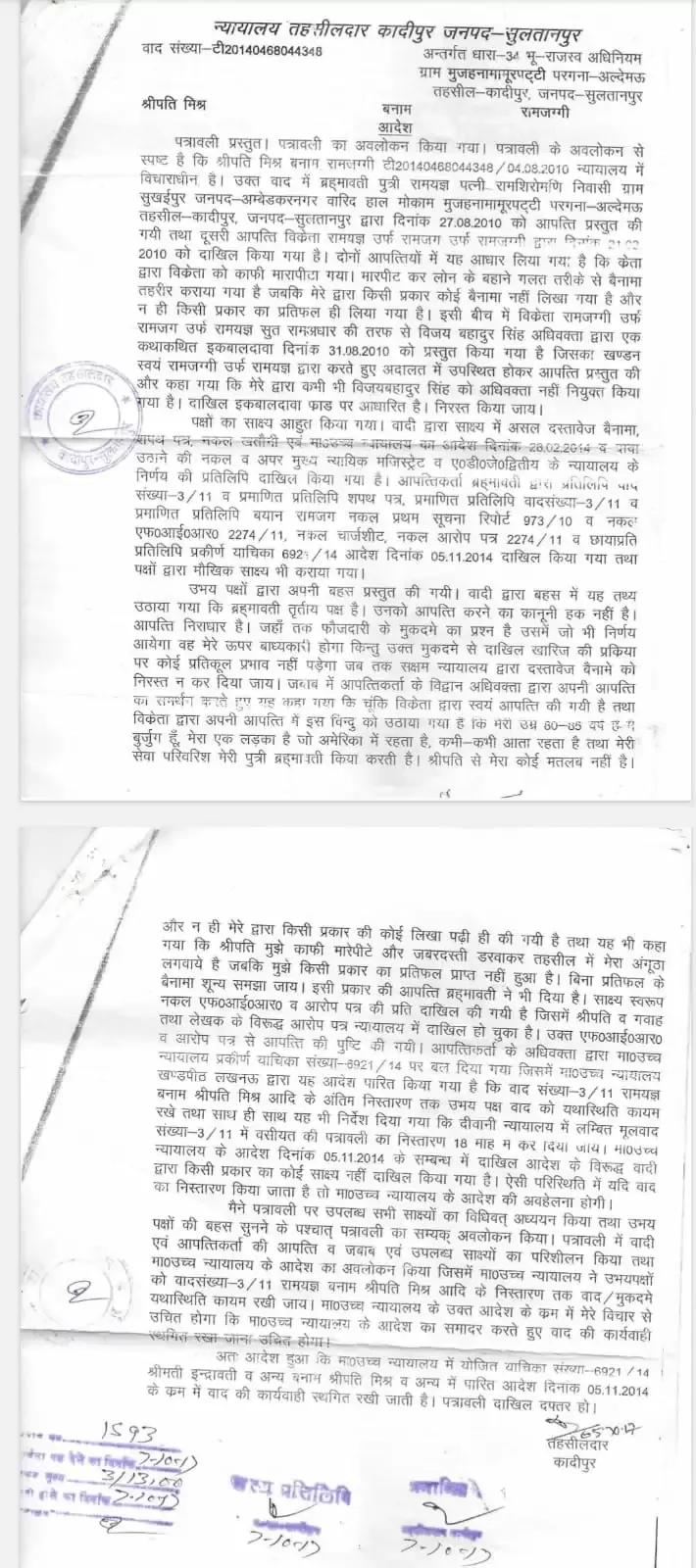 4- हाईकोर्ट और सिविल कोर्ट से कोई आदेश या फैसला नहीं आया है वहाँ श्रीपति मिश्रा भाग रहे है। तहसील कादीपुर को ही दाखिल खारिज के आदेश की इतनी जल्दबाजी क्यों जबकि मामला 12 वर्षो से लंबित था?