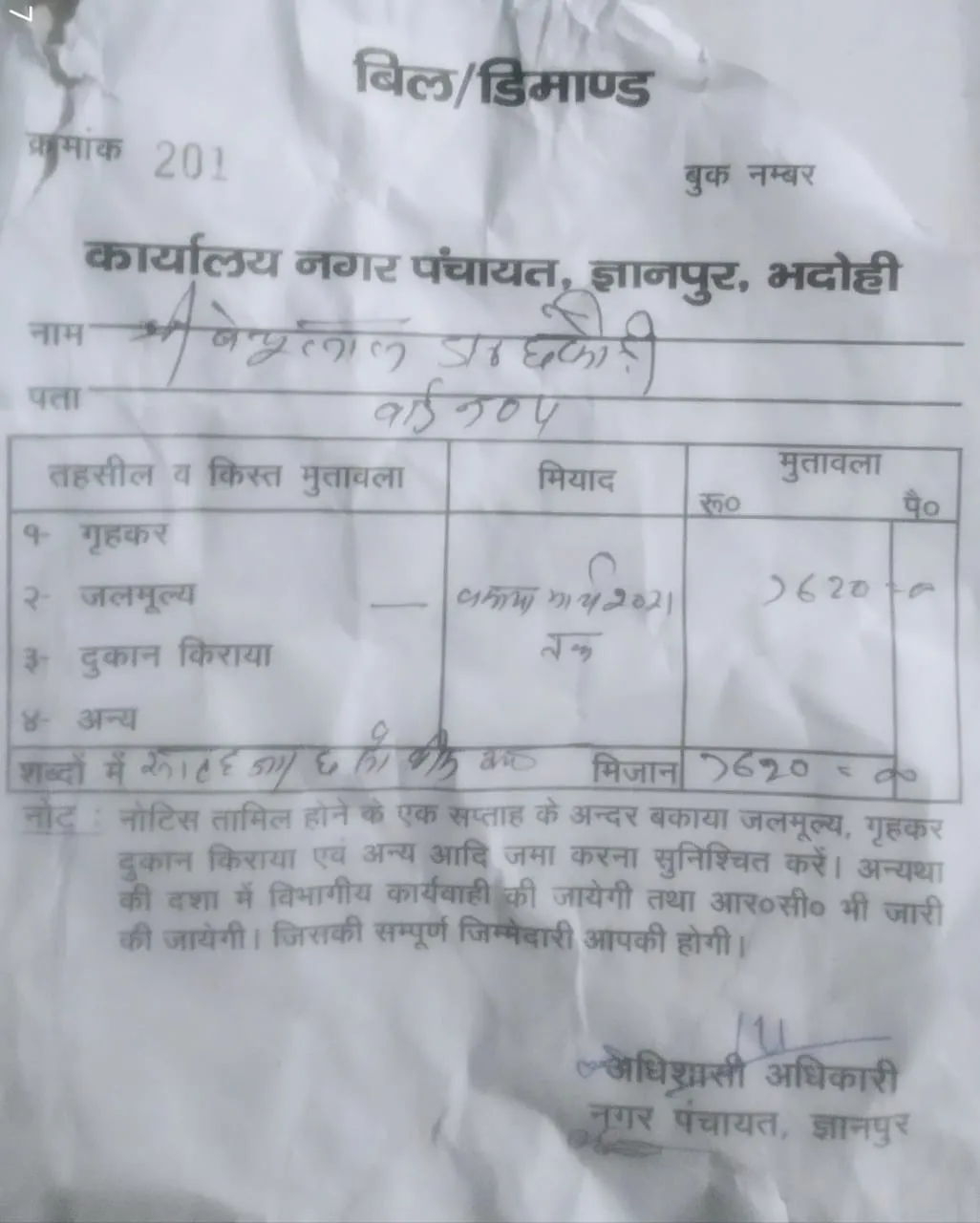 नगर पंचायत ज्ञानपुर के अधिशासी अधिकारी की ओर से मंगलवार को जल मूल्य वसूली में भ्रष्टाचार का ताजा मामला संज्ञान में आया है। नगर पंचायत के अधिशासी अधिकारी ने लगभग 22 वर्षों पूर्व मृतक के नाम से जल कनेक्शन के भुगतान के लिए नोटिस जारी की है।