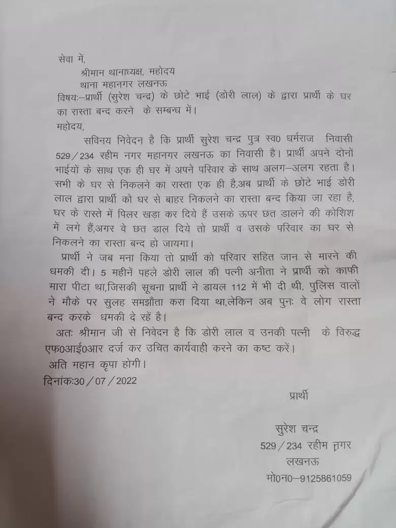 थाना महानगर के अंतर्गत रहीम नगर निवासी सुरेश चंद पुत्र धर्मराज अपने परिवार एवं दो भाइयों के परिवार के साथ एक ही घर अलग अलग हिस्से में रहता है सभी के घर से निकलने का एक ही रास्ता है सुरेश चंद्र के मुताबिक उसका छोटा भाई डोरीलाल उसके परिवार के निकलने वाले रास्ते पर पिलर खड़ा करना चाहता है l