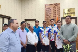 देवरिया। स्कूल गेम्स फेडरेशन आफ इण्डिया राष्ट्रीय वालीबाल अंडर 17 प्रतियोगिता में आवासीय छात्रावास वालीबाल के तीन खिलाड़ियों के राष्ट्रीय प्रतियोगिता में स्वर्ण पदक जीतकर देवरिया आगमन पर स्वागत किया गया। जिलाधिकारी अखण्ड प्रताप सिंह एवं अपर जिलाधिकारी प्रशासन गौरव...