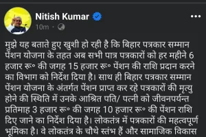 पटना-: मुख्यमंत्री नीतीश कुमार ने बुधवार को सोशल मीडिया के माध्यम से यह जानकारी दी कि बिहार पत्रकार सम्मान पेंशन योजना के तहत अब राज्य के सभी पात्र पत्रकारों को हर महीने 6,000 रुपए की जगह 15,000 रुपए पेंशन के... बिहार विधानसभा में विपक्ष ने किया जोरदार हंगामा